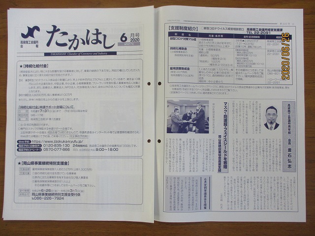 高梁商工会議所会報6月号を発行しました。表紙は、「持続化給付金」申請サポート会場が、高梁商工会議所3Fに7月31日(金)まで開設の案内&「持続化給付金」内容紹介、そして岡山県が創設した「岡山県事業継続特別支援金」(上限1,000万円)案内。新型コロナウイルス感染症に関する高梁商工会議所「経営相談窓口」と中小企業・小規模事業者向け向け支援制度のご案内(新型コロナ対策マルケイ「日本政策金融公庫」、小規模企業持続加補助金(追加対策枠)、雇用調整助成金(特例措置をさらに拡大))他、そして高梁商工会議所ホームページに、新型コロナウイルス感染症関連中小企業向け支援策「バナー」を設置)等。高梁商工会議所青年部金石会長挨拶文、岡山県建設業協会高梁支部が、高梁市と高梁医師会へマスク、防護服、フェイスシールドを寄贈、高梁商工会議所6月定例常議員会(6月12日・高梁国際ホテル)開催報告、新型コロナウイルス感染症の影響に係る特別経営相談会①「雇用調整助成金個別相談会(毎週金曜日・1社1時間)」、②各種補助金に係る個別相談会(毎週火曜日・1社1時間)」(高梁商工会議所主催)開催案内、また、高梁の飲食店応援キャンペーン「テイクアウト取扱い店一覧表」ホームページ全面リニューアル報告及び、お弁当などテイクアウト商品(店名と一緒に)紹介第2回目、事務局日誌、編集後記などです。吉備国際大学社会学部高橋ゼミと連携した取材「産学連携シリーズ」は、鯉正酒造㈱代表取締役永井芳郎氏⑤です。またご覧下さい。