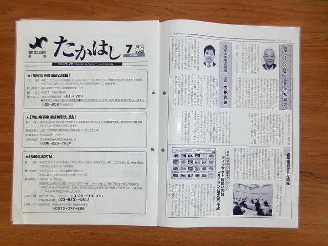高梁商工会議所会報7月号が発行されました。表紙は、高梁市中小企業等事業継続支援金、岡山県事業継続特別支援金、「持続化給付金」内容について&高梁商工会館3Fの持続化給付金申請サポート会場は、7月30日(木)で終了のお知らせ 2p以降に、高梁ライオンズクラブ平松会長挨拶文、高梁市青年経済協議会大手会長挨拶文、高梁商工会議所通常議員総会(6月26日・高梁国際ホテル)開催報告、高梁の飲食店応援キャンペーン「テイクアウト取扱い店一覧チラシ」第2段(カラー版)作成・発行(新聞折り込みでPR)等。また①新型コロナウイルス感染症に関する高梁商工会議所「経営相談窓口」と中小企業・小規模事業者向け向け支援制度のご案内(新型コロナ対策マルケイ「日本政策金融公庫」、小規模企業持続加補助金(追加対策枠)、雇用調整助成金)、高梁商工会議所ホームページに、新型コロナウイルス感染症関連中小企業向け支援策「バナー」を設置)、新型コロナウイルス感染症の影響に係る特別経営相談会①「雇用調整助成金個別相談会(毎週金曜日・1社1時間)」、②各種補助金に係る個別相談会(毎週火曜日・1社1時間)」(高梁商工会議所主催)案内、キャッシュレス決済「JPQR事業者向け説明会・申込会」案内(8月24日、26日、27日開催・高梁商工会議所主催)、65歳超雇用推進助成金案内等、そして事務局日誌、編集後記などです。吉備国際大学社会学部高橋ゼミと連携した取材「産学連携シリーズ」は、鯉正酒造㈱代表取締役永井芳郎氏⑥です。