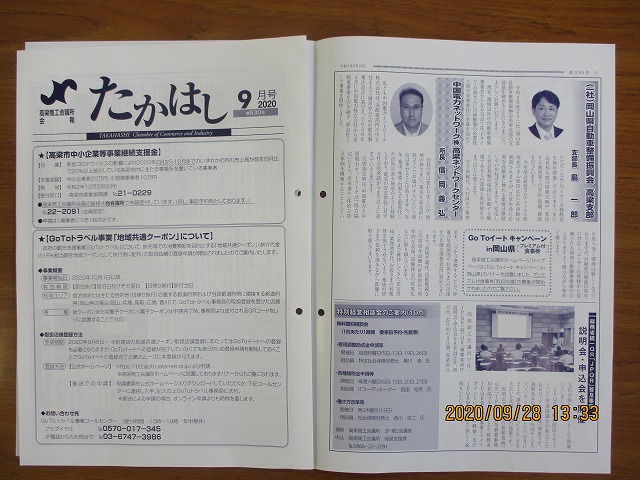 高梁商工会議所会報9月号が発行されました。表紙は、GOTOトラベル事業「地域共通クーポン」内容並びに取扱加盟店募集、そして高梁市中小企業等事業継続支援金案内(高梁商工会議所で申請受付窓口実施中)について 2p以降に、岡山県自動車整備振興会高梁支部島支部長挨拶文、中国電力ネットワーク㈱高梁ネットワークセンター信岡所長挨拶文、総務省統一QR「JPQR」普及事業・キャッシュレス決済「事業者向け説明会・申込会」(8月24日、26日、27日開催報告・高梁商工会議所主催)、GOTOイートキャンペーンin岡山県「プレミアム食事券」取扱店舗募集案内並びに高梁商工会議所ホームページに「GOTOイートキャンペーンin岡山県」のバナー設置案内など。また、新型コロナウイルス感染症の影響に係る特別経営相談会①「雇用調整助成金個別相談会(毎週月曜日・1社1時間)」、②各種補助金に係る個別相談会(毎週火曜日・1社1時間)」(高梁商工会議所主催)案内、また①新型コロナウイルス感染症に関する高梁商工会議所「経営相談窓口」と中小企業・小規模事業者向け向け支援制度のご案内(新型コロナ対策マルケイ「日本政策金融公庫」、小規模企業持続加補助金(追加対策枠)、雇用調整助成金、高梁商工会議所ホームページに、新型コロナウイルス感染症関連中小企業向け支援策「バナー」を設置)案内などです。また検定試験のご案内「簿記検定・福祉住環境コーディネーター検定試験」、×梁(かけはし)お弁当マルシェ(高梁市図書館)案内、アクサ生命保険広告、そして事務局日誌、編集後記などです。吉備国際大学外国語学部高橋ゼミと連携した取材「産学連携シリーズ」は、鯉正酒造㈱代表取締役永井芳郎氏⑧です。