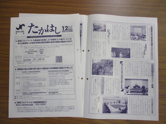 高梁商工会議所会報12月号が発行されました。表紙は、新型コロナウイルス感染症により事業収入が減少している中小企業者等への令和3年度分固定資産税・都市計画税の軽減の案内、そして「岡山県新しい生活様式実践事業者補助金」案内並びに、「高梁市店舗内感染拡大防止対策支援補助金」(申請期限・令和3年1月29日まで延長)案内、そして高梁商工会議所新型コロナウイルス「経営相談窓口」案内です。2p以降に、講師に近藤高梁市長をお招きして開催した、高梁商工会議所11月常議員会開催報告、吉備国際大学社会科学部と連携し10月からでシリーズで市内経営者が同大学で講義「リーダーシップと経営者」(高梁学生応援協力会・高梁商工会議所協力)していることを紹介、同時に11月25日には、マイコー㈱取締役磯村尚子氏が講師となり学生へ講義されたことを報告、また吉備国際大学シャルム岡山高梁へ支援金を贈呈(高梁学生応援協力会・高梁商工会議所)報告、高梁市労務改善協議会主催「年末調整説明セミナー」(高梁商工会議所等共催)開催報告、そして備中松山城の清掃活動(高梁市まちづくりボランティアセンター主催)報告、商工会議所議員の異動紹介、(一社)宇治雑穀研究会が、農山村の活性化に取り組む団体を表彰する令和2年度「豊かなむらづくり全国表彰」で、農林水産大臣表彰を受賞報告、高梁市地域活性及びマイナンバーカード普及促進事業「まいにゃんばー商品券」発行事業紹介などです。女性会だよりは「絵手紙講習会」開催報告、また新型コロナウイルス感染症の影響に係る特別経営相談会①「雇用調整助成金個別相談会(1月25日(月)・1社1時間)」、②各種補助金に係る個別相談会(毎週火曜日・1社1時間)(高梁商工会議所主催)1月開催案内、そして働き方改革等個別相談会案内、小規模企業共済案内、編集後記などです。吉備国際大学社会学部高橋ゼミと連携した取材「産学連携シリーズ」は、鯉正酒造㈱代表取締役永井芳郎氏⑪です。またご覧ください。