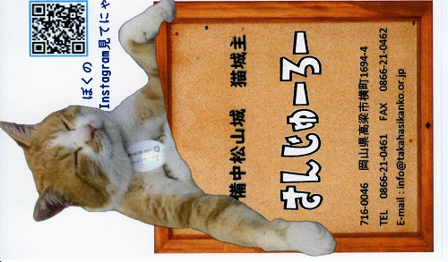 備中松山城に「猫城主・さんじゅーろー」が、昨年12月に正式デビューしました。さんじゅーろーは、昨年夏から住み着き、その後一時行方不明となりましたが、無事保護された推定3歳の雄猫。原則備中松山城の本丸管理事務所に常駐し、午前10時と午後2時の1日2回、散歩をかねて城内を見回りします。(病院受診のときや用事があるときは不在にすることもあります)