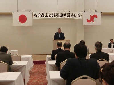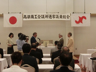 高梁商工会議所では、6月29日(金)午後6時から高梁国際ホテルで、平成30年度通常議員総会を開催いたしました。当日は約50人が出席、藤岡会頭の挨拶の後、①平成29年度事業報告承認について、②平成29年度一般会計承認について、③平成29年度委託団体等会計承認について、④平成29年度中小企業相談所会計収支決算書承認について、⑤定款の一部変更について、⑥常議員の選任についてのすべての議案が満場一致で承認されました。議事終了後、春の叙勲・褒章で当商工会議所監事・元会頭谷本明久氏が「旭日小綬章」を受賞、また常議員安藤建司氏が「瑞宝双光章」を受賞されたことを報告し、藤岡会頭から谷本氏、安藤氏にそれぞれに日本商工会議所三村会頭からの「賀状」を贈呈いたしました。