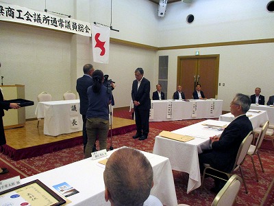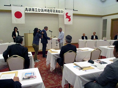 高梁商工会議所では、6月28日(金)午後6時から高梁国際ホテルで、令和元年度通常議員総会を開催いたしました。当日は約50人が出席、藤岡会頭の挨拶の後、①平成30年度事業報告承認について、②平成30年度一般会計承認について、③平成30年度委託団体等会計承認について、④平成30年度中小企業相談所会計収支決算書承認について等すべての議案が満場一致で承認されました。議事終了後引き続き表彰を行い、議員の縄手常太郎氏が中国経済産業局長表彰を受賞したことから、藤岡会頭から縄手氏に中国経済産業局長からの「表彰状」を贈呈いたしました。またこの度、議員の藤田常夫氏が退任されたことから、藤岡会頭から藤田氏に日本商工会議所三村会頭からの「感謝状」を贈呈いたしました。最後に、報告事項として「西日本豪雨災害被災事業者支援状況を説明し、高梁商工会議所復興グループ加入事業所のグループ補助金交付決定状況等について報告いたしました。