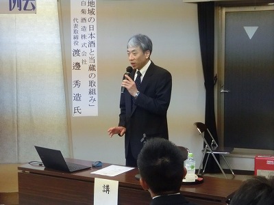 青年部創立20周年事業「清酒造り」の一環として、白菊酒造(株)渡辺社長をお招きし、講演をいただきました。青年部では事業を開催することで単会メンバーの一体感を高めようと、「モノ消費」から「コト消費」(体験型)への転換(消費者の嗜好が所有する価値から経験する価値へ移行)を促し、会員企業におけるコト消費という新たな事業モデルの確立と、地域において魅力的な消費空間の造像につなげることを目指しています。