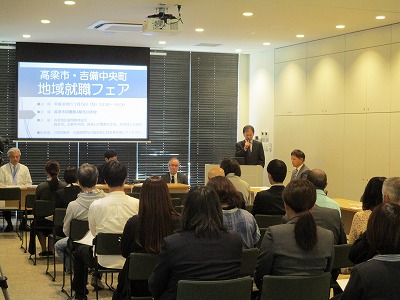 平成30年度「高梁市・吉備中央町地域就職フェア」(高梁地区雇用開発協会・高梁公共職業安定所・高梁市・吉備中央町・高梁商工会議所等主催を、11月5日(月)午後1時30分から高梁市図書館で開催いたしました。フェアには高梁市・吉備中央町の企業11社が参加、高梁公共職業安定所丸山所長の挨拶の後、高梁公共職業安定所から面接会の流れについて説明があり、出席いただいた皆さんが、希望する企業のブースを回り、面接を行われました。