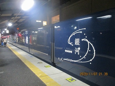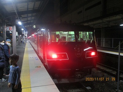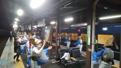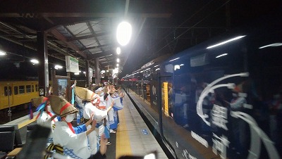 JR西日本では京都・大阪~出雲間(伯備線経由)に、9月11日(金)から11月28日(土)までの期間新型観光列車「WEST EXPRESS 銀河」を運行されています。JR備中高梁駅には毎週水曜日と土曜日に、出雲市発の大阪行上りの「銀河」が21:25に到着、35分間停車し22:00に発車します。11月7日(土)には10月31日(土)に続き高梁商工会議所女性会が参加し、歓迎イベントとして備中松山踊りを披露いたしました。今回はプラットホームで松山踊り・やとさ踊りを披露し、最後は乗客の皆さんを参加者全員で見送りました。