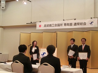 高梁商工会議所青年部(山本則幸会長)では、4月27日(金)午後7時から高梁国際ホテルにて平成30年度総会を開催いたしました。当日は来賓、会員約40人が出席、山本会長の挨拶の後、高梁商工会議所藤岡会頭、高梁市近藤市長、久徳岡山県議会副議長から祝辞をいただきました。続いて議事に入り、平成29年度事業報告・決算の承認、平成30年度役員(案)並びに組織(案)、事業計画(案)、予算(案)を議決しました。そして新役員を代表して、10月の臨時総会で選任された上杉明生新会長が就任の挨拶を行い、最後に、卒業生に29年度山本会長より感謝状と記念品が贈られました。