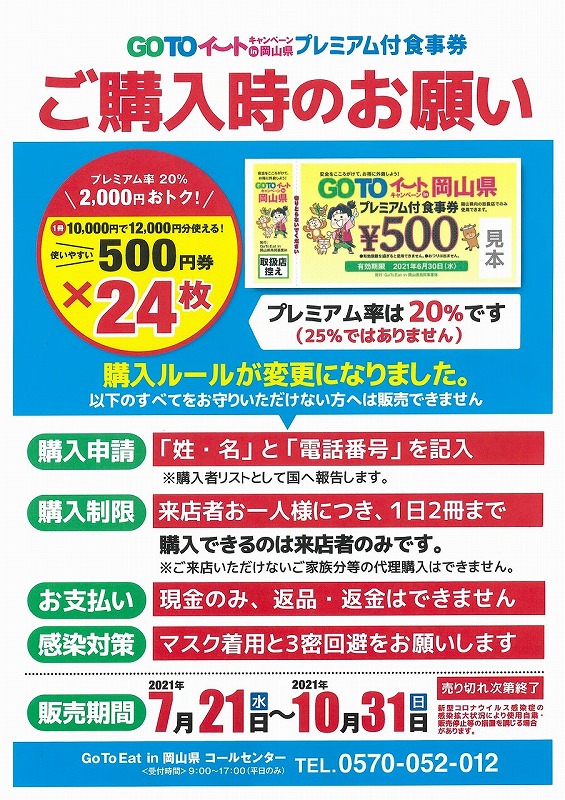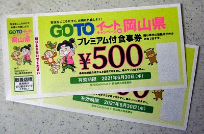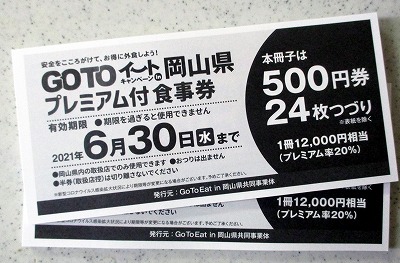 高梁商工会議所では、飲食店支援の一環として、GOTOイートプレミアム付食事券「販売所」に登録しています。昨年10月21日(水)から、高梁商工会議所事務局でプレミアム食事券(第1弾)の販売を行ってきました。今回第2弾のGOTOイートプレミアム付食事券を、本日から販売をスタートしました。尚、第2段の「販売価格」1冊 10,000円(500円×20枚綴り 12,000円相当)となっております。(販売は1日・1人2冊まで) ◇食事券は、令和3年11月30日まで取扱店舗で使用できます。