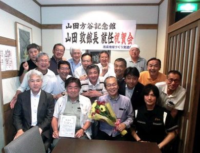 山田方谷記念館が開館し、当地域づくり交流会メンバーの山田方谷玄孫の山田敦さんが館長に就任されましたので、6月例会を兼ねて令和元年6月3日(月)午後6時30分から「山田方谷記念館館長就任祝賀会」を開催いたしました。当日は西会長の挨拶、山田館長の挨拶の後、山田館長に感謝状と花束を贈呈いたしました。引き続き交流会を行い、山田館長を囲んで懇談いたしました。