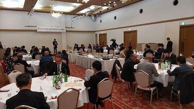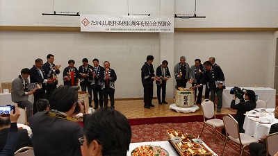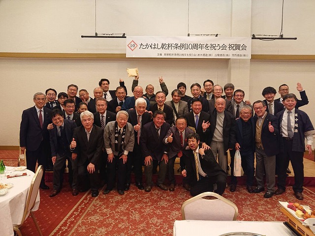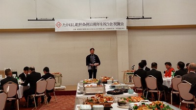 たかはし乾杯条例10周年を祝う会「祝賀会」が、12月9日(土)午後6時から高梁国際ホテルで開催されました。祝賀会は高梁市内の蔵元3社(白菊酒造㈱、赤木酒造㈱、芳烈酒造㈱)の主催で、当地域づくり交流会も後援・協賛し多くのメンバーが参加いたしました。当日は約70人が出席、白菊酒造㈱渡辺秀造社長の挨拶の後、高梁市近藤市長ら来賓が挨拶され高梁市議会石田議長の乾杯で懇親会がはじまり、途中お楽しみ抽選会などもあり、参加者は藏元3社の地酒を楽しんでいました。高梁市産の清酒の普及促進に関する条例は、高梁の地酒による乾杯の習慣を広めることにより、その普及、酒造業の発展、郷土愛の醸成等を図ることを目的に2013年に制定されました。