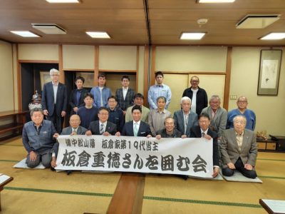 備中松山藩 板倉家19代目当主「板倉重徳さんを囲む会」を、令和7年4月26日(土)午後5時30分から開催しました。当日は約20人が出席、板倉重徳さん、石田高梁市長に挨拶をいただいた後、山田方谷記念館山田敦館長の乾杯で懇親会を行い交流を深めました。