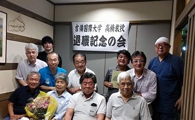 平成2年の吉備国際大学開学当時からまちづくり関係でご指導・交流いただいています高橋正巳先生が今春退職されたことから、感謝の気持ちを込め7月8日(土)午後6時から高梁市内有志メンバーで退職記念の会を開催しました。当日は高橋先生よりご挨拶をいただいた後、西会長から花束と記念品が贈られ、高橋先生を囲み懇親を深めました。