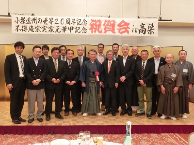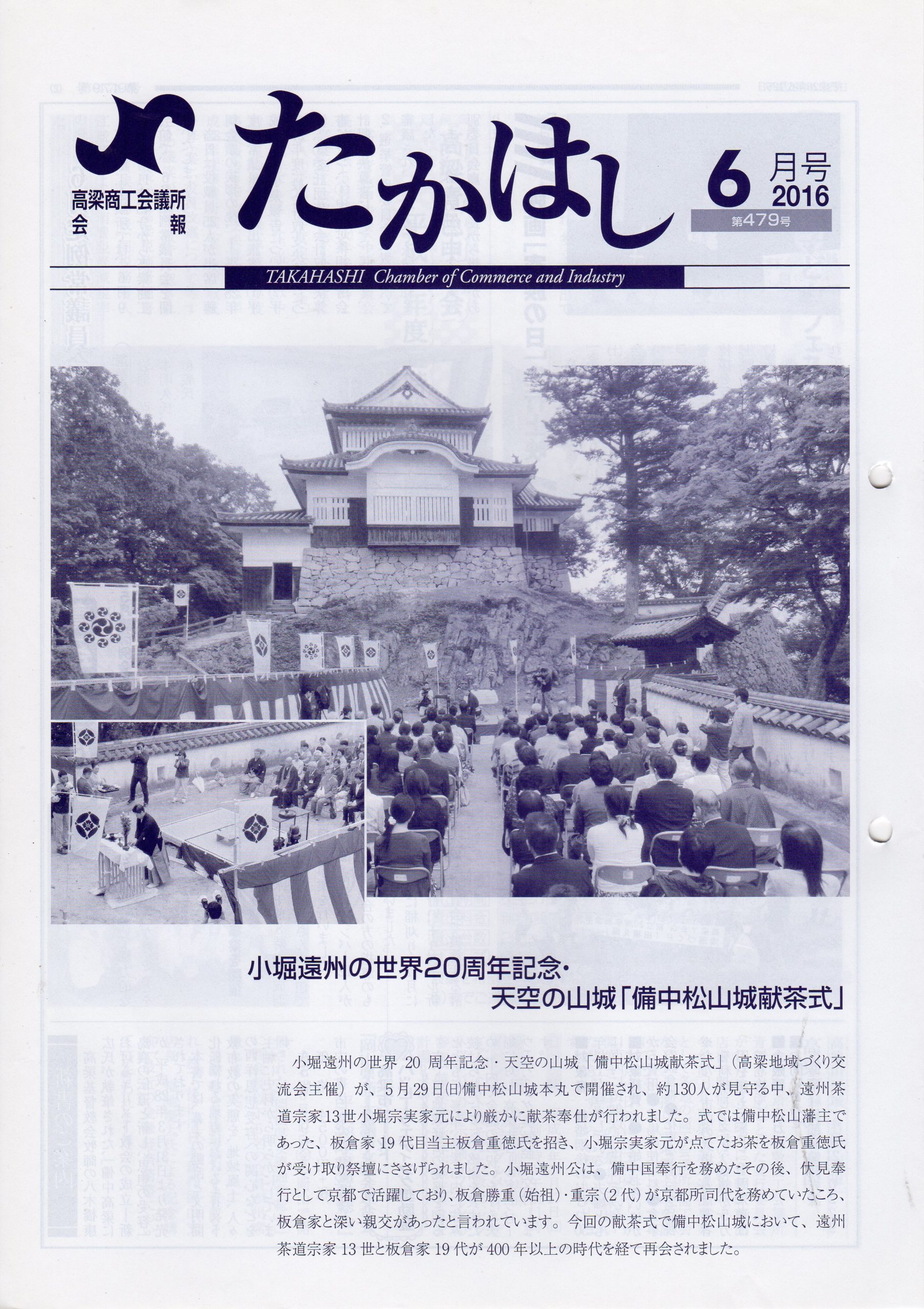 高梁地域づくり交流会では、平成8年にスタートした江戸初期の備中国奉行小堀遠州公顕彰事業である「小堀遠州の世界」の20周年を記念し、遠州公の子孫でもる遠州茶道宗家13世小堀宗実家元による「献茶式」を、5月29日(日)備中松山城本丸で開催いたしました。本丸に献茶式の手前座を設置し、幕で仕切って会場を整備、全国から出席された茶道関係者、来賓、主催者、また観光客約130人が見守る中、厳かに献茶奉仕が行われました。特に7代にわたって備中松山藩を治め最後の藩主であった板倉家の子孫である、板倉家19代目当主板倉重徳氏を招き、小堀宗実家元が点てたお茶を板倉重徳氏が受け取り祭壇にささげられました。小堀遠州は、備中国奉行を務めたその後、伏見奉行として京都で活躍しており、板倉勝重(始祖)・重宗(2代)が京都所司代を務めていたころ、板倉家と深い親交があったと言われています。今回の献茶式で備中松山城において、遠州茶道宗家13世と板倉家19代が400年以上の時代を経て再会されました。こうした経緯もあり、城見橋公園をはじめ、ふいご峠から登山道、そして本丸、二の丸に小堀家と板倉家の家紋の旗を設置しました。備中松山城で献茶式は茶道の流派の中で、今回の遠州流茶道が初めての開催ともなりました。また二の丸では呈茶席を設け、遠州流で点てた抹茶を、参加者や観光客に振る舞いました。また前日5月28日(土)には高梁国際ホテルで祝賀会を開催いたしました。