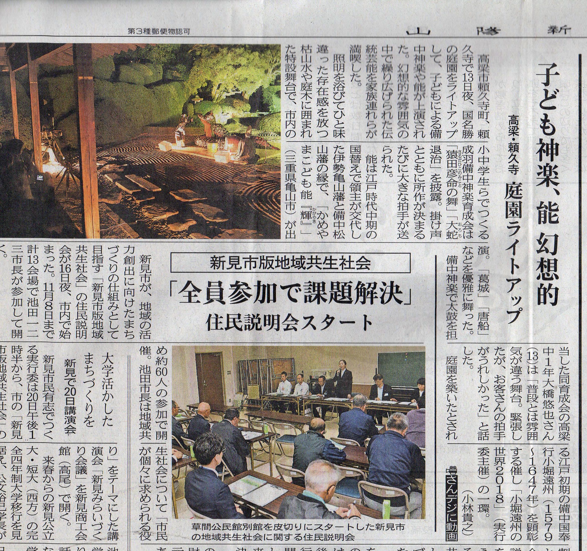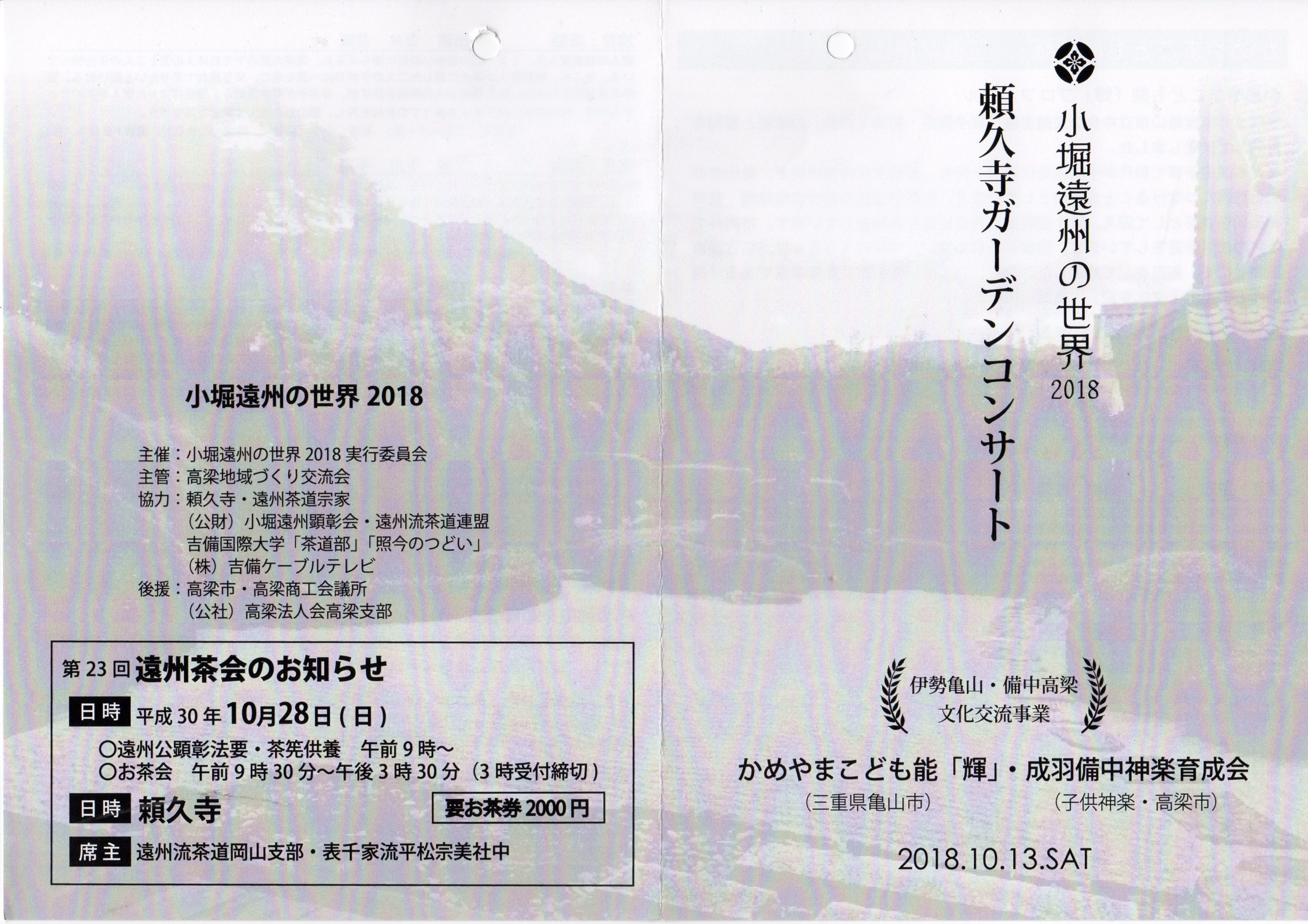 頼久寺ガーデンコンサート(同実行委員会主催・高梁地域づくり交流会主管、高梁商工会議所等後援)を、平成30年10月13日(土)に、高梁市の頼久寺で、国名勝庭園をライトアップして開催しました。江戸初期の備中国奉行・小堀遠州公を顕彰する、小堀遠州の世界2018の一環で23回目を迎えました。今回は、かめやま子ども能「輝」(三重県亀山市)と成羽備中神楽育成会(子供神楽・高梁市)に出演いただきました。三重県亀山市と高梁市は、伊勢亀山領主の板倉家と備中松山領主の石川家が江戸時代、転封で互いの領地を交換したという歴史的なつながりが深く、子ども能と子供神楽の競演を通じて「伊勢亀山・備中高梁」文化交流事業として両市の交流を促進していくことを目的に企画したものです。子ども能では、9人の子供たちが、竹生島、清経、吉野天人など8演目を勧世流能楽師竹田邦弘先生の謡に合わせ舞を舞いました。また、子供神楽では5人の子供たちが猿田彦の命、大蛇退治を舞い、両市の子供たちの熱演に大きな拍手がおくられていました.
