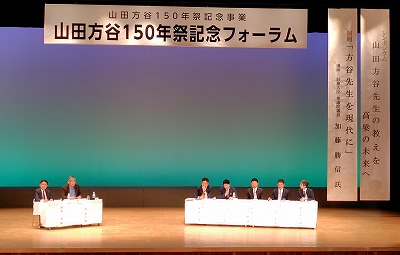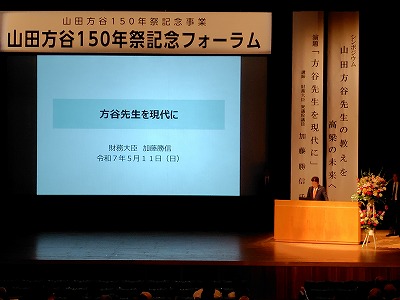 また翌5月11日(日)には高梁総合文化会館において「山田方谷150年祭記念フォーラム」(同実行委員会主催)が開催されました。最初に、松本圭司実行委員会会長の挨拶の後、衆議院議員財務大臣加藤勝信氏(山田方谷の志に学ぶ国会議員連盟会長)より「方谷先生を現代に活かす」をテーマに基調講演がおこなわれ、続いてのシンポジウム「山田方谷先生の教えを高梁の未来へ」では、元衆議院議員 小野晋也氏、山田方谷直系子孫 野島透氏をコーディネーターに、財務大臣 加藤勝信氏、岡山県知事 伊原木隆太氏、岡山県議会議長 久徳大輔氏、高梁市長 石田芳生氏、高梁方谷会 網本善光氏によるパネルディスカッションが行われました。また交流会が市内で開催され、高梁地域づくり交流会からもフォーラム・交流会に参加いたしました。