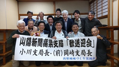 山陽新聞高梁支局「歓送迎会」を、令和5年10月18日(水)午後6時30分から、山陽新聞高梁支局小川支局長と岡崎(前)支局長に出席いただき10月例会を兼ねて開催いたしました。当日は9月1日にご栄転された岡崎(前)支局長に感謝状と花束を贈呈し、挨拶をいただきました。続いて高梁支局に着任された小川(新)支局長に挨拶いただいた後、懇親会を行いました。会では参加者全員より自己紹介、活動報告等が行われ新旧支局長と懇親を深め有意義な歓送迎会となりました。