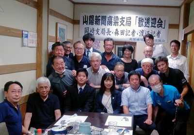山陽新聞高梁支局「歓送迎会」を、令和4年10月4日(月)午後6時30分から10月第1例会を兼ねて開催いたしました。当日は山陽新聞高梁支局岡﨑支局長、渡辺記者、森田記者の3人に出席いただきました。会では岡﨑支局長の挨拶の後本社に栄転された森田記者に感謝状と花束を贈呈し、着任された渡辺記者から挨拶をいただき懇親会を行いました。当地域づくり交流会では高梁支局開設以来、約30年にわたり歓送迎会を開催しています。