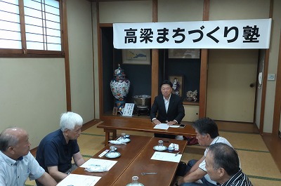 高梁地域づくり交流会では、8月21日(水)午後6時30分から「高梁まちづくり塾」を8月第2例会を兼ねて開催いたしました。当日は16人が出席、西会長の挨拶の後、講師にお招きした岡山県議会議長 久徳大輔氏より「岡山県政について」をテーマに講演をいただきました。終了後、懇親会を開催、メンバーと意見交換すると共に久徳議長を囲んで和やかに懇談いたしました。