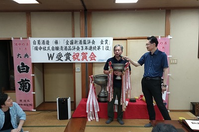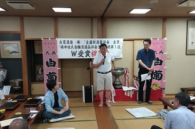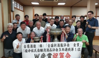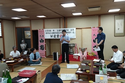 当地域づくり交流会メンバー企業であります白菊酒造㈱が 「全国新酒鑑評会金賞」並びに「備中杜氏自醸清酒品評会3年連続第1位」を受賞したことから、令和6年8月3日(金)午後6時30分から「W受賞祝賀会」を8月第1例会を兼ねて開催いたしました。当日は約30人が参加、RSK元アナウンサー石田好伸さんの司会で開会、最初に備中社による備中神楽を鑑賞いたしました。祝賀会では地域づくり交流会西会長の挨拶の後、来賓の高梁市近藤市長、岡山県議会久徳議長から挨拶をいただきました。続いて白菊酒造㈱渡辺秀造社長並びに三宅杜氏から挨拶をいただき、高梁市産業経済部妹尾部長の乾杯で懇親会に入りました。懇親会では白菊酒造㈱のW受賞をお祝いすると共に、受賞したお酒と料理を楽しみました。また石田さんの進行で参加者全員が自己紹介を行い、参加者同士交流を深めました。