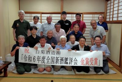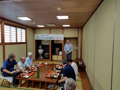 当地域づくり交流会メンバー企業であります白菊酒造㈱が 令和6年度「全国新酒鑑評会金賞」を受賞したことから、令和7年7月16日(水)午後6時30分から7月例会を兼ねて開催いたしました。当日は地域づくり交流会西会長の挨拶の後、白菊酒造㈱渡辺酵造会長並びに三宅杜氏から挨拶をいただきました。そして高梁警察署大平副署長の乾杯で懇親会に入りました。懇親会では白菊酒造㈱の受賞をお祝いすると共に、魚富特製の鮎コース料理と受賞したお酒と料理を楽しみました。また、途中から参加いただきました石田市長からご祝辞をいただき、参加者同士交流を深めました。